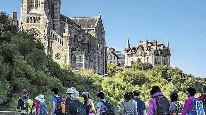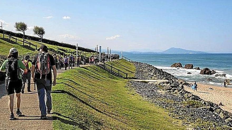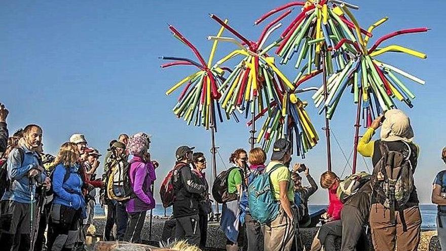 A lo largo de los 23 kilómetros de distancia, los caminantes disfrutaron ayer de varias paradas cargadas de arte contemporáneo. La primera actividad tuvo lugar en Anglet, donde conocieron la historia de tres esculturas: La habitación del amor, donde dos enamorados murieron una noche en el interior de una cueva; un contenedor de obra con un pequeño cine en su interior, y unas palmeras construídas con churros de natación, llamada Florida.