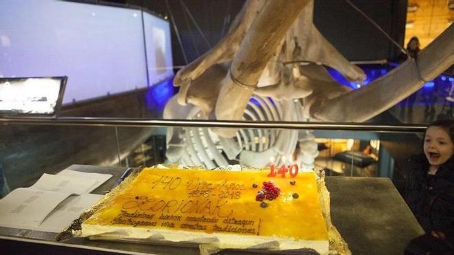 La estructura ósea de ballena, tesoro del Aquarium, cumplió ayer 140 años y fue objeto de un homenaje. Más de quince millones de personas han visto este esqueleto, que fue arponeado por Roke Etxabe, bisabuelo de Josune Izagirre, una de las invitadas al acto. También asistió el presidente del Aquarium, José Ignacio Espel, su directora, Esther Irigaray, y el bertsolari Andoni Egaña. Foto: Esti Veintemillas