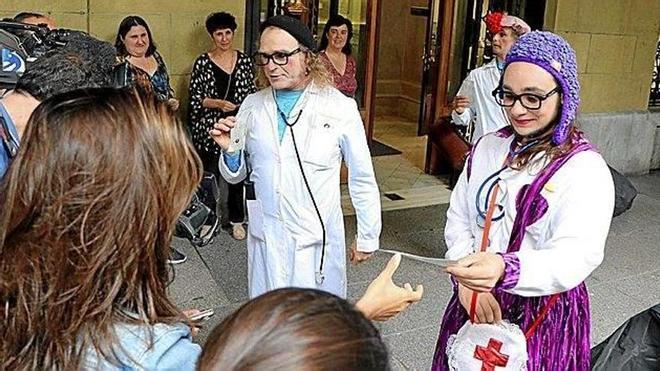 sensibilización. Payasos de la compañía Oihulari Klown se pusieron ayer la bata de médico para recetar remedios contra la homofobia en Donostia. Los actores permanecieron buena parte de la mañana en la plaza de Gipuzkoa, donde ofrecieron a los paseantes “jarabe contra la homofobia y dosis extra de convivencia”. La iniciativa se enmarca en las diferentes acciones de sensibilización y visibilización que esta semana están teniendo lugar con motivo de la celebración, hoy, del día del Orgullo LGTBI. Foto: N.G.