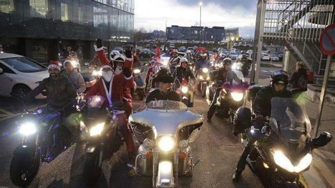 donostia. Personal de Osakidetza, del departamento de Justicia y ertzainas volvieron ayer a llenar de ilusión a los niños y niñas ingresados en las distintas unidades del Hospital Universitario Donostia. Sobre sus motos engalanadas con una iluminación muy navideña y tras haber llevado a cabo una recogida previa de juguetes, estos singulares pajes vivieron también una jornada muy emotiva. Y es que una de las moteras que puso en marcha esta iniciativa hace algunos años y que trabajaba en el centro, Arantza Corcuera, falleció el pasado 21 de diciembre. Por este motivo, las cerca de 20 personas que participaron esta singular cabalgata vivieron una experiencia agridulce, entre la alegría y el homenaje. Foto: Gorka Estrada