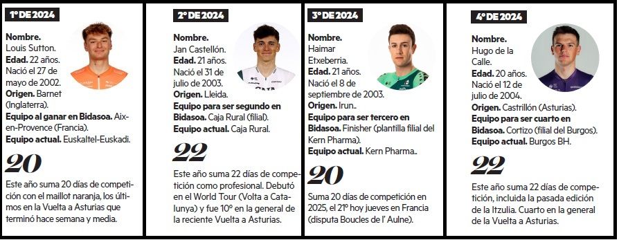 La Vuelta a Bidasoa celebra desde este jueves y hasta el sábado una nueva edición, posiblemente sin el prestigio de antaño pero conservando para los ciclistas el aliciente del profesionalismo: todo aquel que brilla a orillas del fronterizo río suele tener plaza asegurada en el pelotón de los mayores, una circunstancia que acredita lo sucedido, por ejemplo, con los cuatro primeros clasificados de 2024. Louis Sutton, Jan Castellón, Haimar Etxeberria y Hugo de la Calle compiten ahora en la élite, curiosamente repartidos entre los cuatro equipos estatales de la segunda división mundial, Euskaltel, Caja Rural, Kern Pharma y Burgos BH, respectivamente.