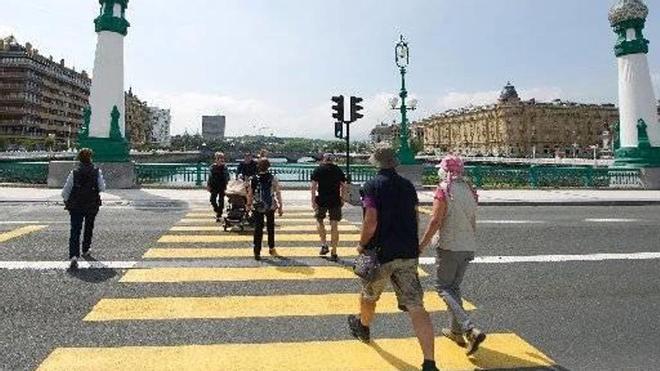 donostia. El puente del Kursaal apareció el fin de semana con un nuevo paso de cebra provisional en mitad del trayecto, así como uno más grande que el habitual en la esquina con el paseo de Salamanca. Al parecer, ambas señalizaciones persiguen preparar el terreno para la llegada de camiones que atravesarán la zona con bloques de piedra para reforzar la escollera del paseo de Salamanca y el espigón de la Zurriola. Foto: R.P.
