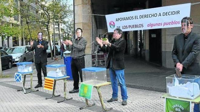 EAJ/PNV Apoyamos el derecho a decidir de algunos pueblos era el lema de una pancarta que los concentrados colocaron entre dos columnas, donde además situaron una urna con la bandera de Igeldo junto a otras tres con las enseñas de Escocia, Catalunya y Usansolo (Bizkaia).