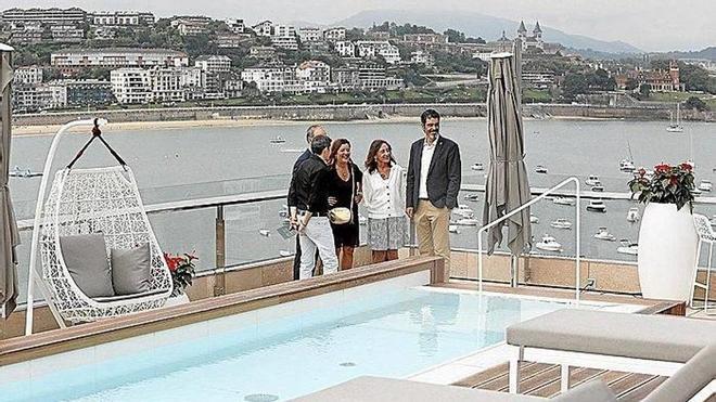turismo. El nuevo hotel Lasala Plaza de Donostia, que abre sus puertas mañana, fue visitado ayer por las autoridades, que comprobaron sus llamativas vistas. El alojamiento cuenta con 58 habitaciones divididas en seis plantas dedicadas a distintos museos de Gipuzkoa. La puesta en marcha del hotel ha supuesto la creación de 46 empleos directos. En la imagen, el alcalde de Donostia, Eneko Goia, y la diputada foral de Movilidad, Marisol Garmendia, entre otros, en la azotea dotada de piscina del nuevo establecimiento. Foto: Gorka Estrada