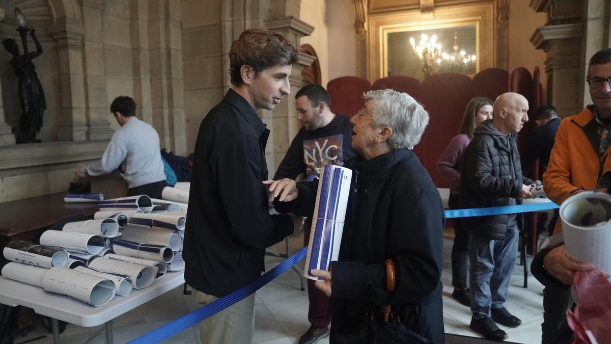 Uno de los puntos de encuentro con mayor atractivo es el Ayuntamiento, ante el que acostumbran a formarse largas colas, al que acudió, entre otras representantes de la corporación, el primer edil donostiarra.