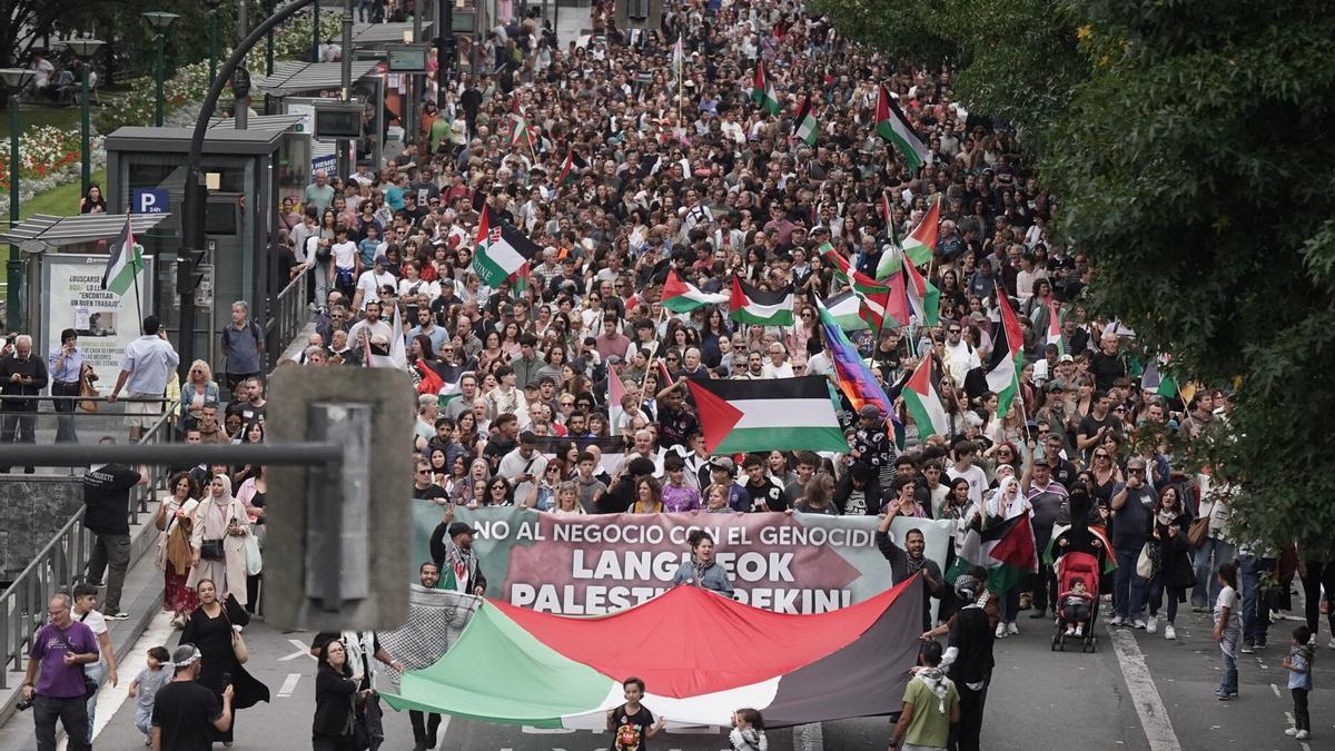 Miles de personas han recorrido esta mañana las capitales vascas para mostrar su apoyo al pueblo palestino en uno de sus momentos más críticos. Convocadas por los sindicatos vascos, las siglas han sido las grandes ausentes de la jornada, que han sido sustituidas por banderas palestinas y carteles con un número: 67.194, que son las personas asesinadas en Gaza en los últimos dos años. Eso, según las cifras oficiales, porque se estima que el número podría ser mucho mayor. "No estamos solos. Ustedes están con nosotros en la misma lucha, en el mismo terreno, en el mismo sueño", ha dicho al concluir la manifestación de Bilbao Fuad Baker, gazatí refugiado en Euskadi desde hace ocho meses. Ese sueño al que se ha referido es una Palestina libre desde el río hasta el mar, uno de los principales lemas coreados, "sin ocupación, sin régimen de apartheid y con la vuelta de los refugiados".