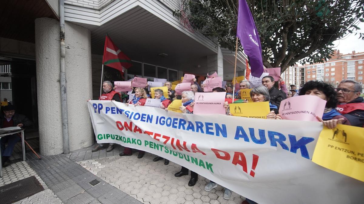 Los pensionistas guipuzcoanos se han concentrado frente a la sede del PP en Donostia para protestar por el voto en contra a la subida de pensiones que emitieron el pasado martes en el Congreso de Madrid lo que, unido a los contrarios de Vox, Junts y UPN, han impedido aplicar la medida en las retribuciones de febrero, a la espera de los próximos pasos que pueda dar el Gobierno español. “No somos moneda de cambio en las disputas partidistas”, han reivindicado, para pedir además una revaloración automática de las pensiones sin tener que “depender de la votación anual del Congreso”.