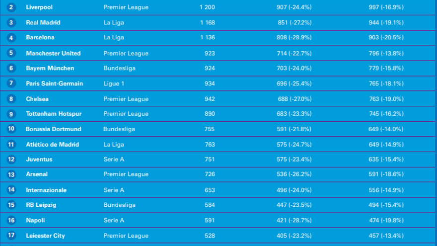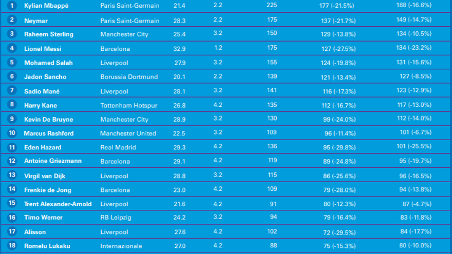 Sin embargo, no son los únicos futbolistas que verán cómo su precio en el mercado ha caído en picado en apenas dos meses, ya que Messi; de 175 a 127 millones, o el jugador del Liverpool Mohamed Salah (155 a 124) son el fiel reflejo de cómo cambiará el fútbol cuando se reanuden las competiciones.