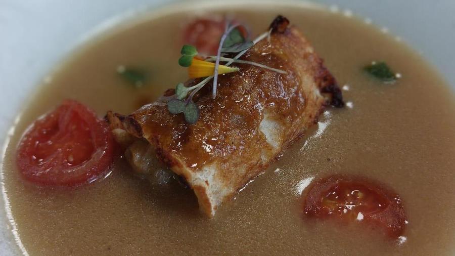 Sopa de hongos y vieiras con canelón de pan relleno de vieiras y hongos glaseado con reducción de manitas, gelée de acelgas y cherry marinado en soja
