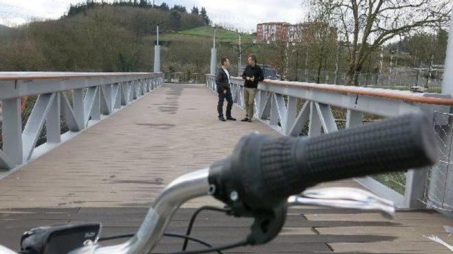 ordizia. El alcalde de Ordizia, Igor Eguren, y el concejal de Movilidad y Desarrollo Sostenible, Iban Asenjo, visitaron ayer la pasarela sobre el río Oria que une el paseo Joseba Rezola y Lazkaibar. Esta infraestructura, que garantiza la seguridad de los usuarios de la pista de skate y lleva el bidegorri hasta las puertas de la empresa CAF, se abrió el 7 de enero. Las labores de urbanización finalizarán en febrero.