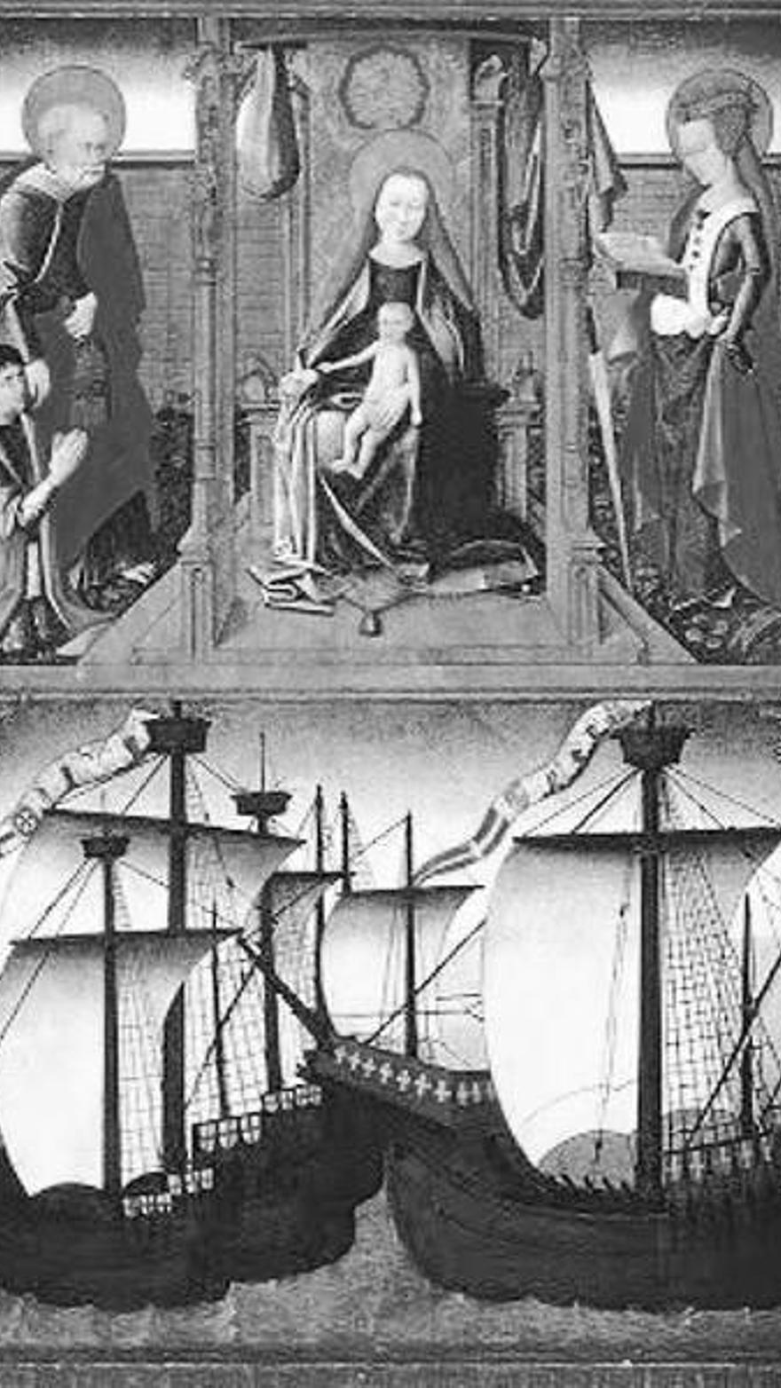 En la parte inferior se ven dos barcos navegando. Se cree que representan "el triunfo de las naves dirigidas por Juan Martínez de Mendaro, en 1475 en el estrecho de Gibraltar, contra el Ejército Portugués y genovés. El barco de la izquierda lleva las armas de Portugal, y el de la derecha las de Castilla".
