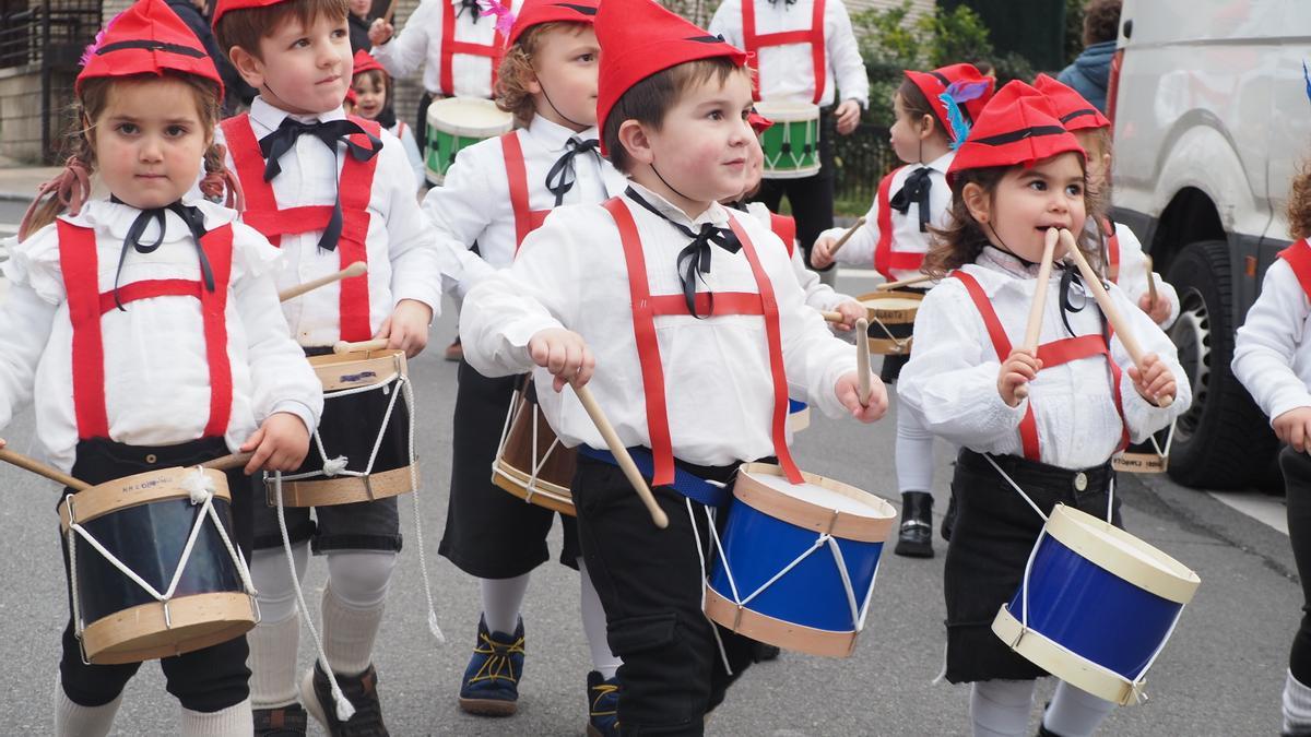 Ehunka neska-mutil bildu dira Izarraizpe, Ikasberri eta Iraurgi ikastetxeetan, jai honetako ohiko doinuak jotzeko.