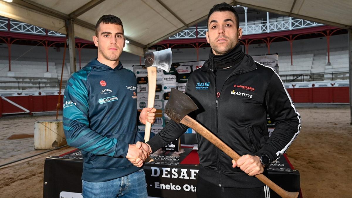 El enfrentamiento tendrá lugar en la plaza de toros de Tolosa. Las entradas costarán 50 euros, y podrán adquirirse en taquilla el mismo día de la prueba, a partir de las 11.00 horas. La apuesta entre los dos aizkolaris se presentó ayer en el coso tolosarra.