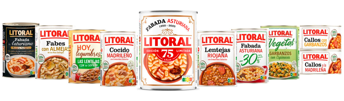 Aunque la fabada es su plato insignia, Litoral ofrece más de 20 recetas y formatos que incluyen, entre otros, el cocido madrileño, las lentejas riojanas y los callos a la madrileña. Un equipo de cocina, liderado por un chef, es quien elabora todas las nuevas recetas de Litoral en la propia fábrica. En línea a las nuevas tendencias, han desarrollado gamas como Hoy Legumbres o Litoral Vegetal, pero siempre con la misma premisa: ingredientes naturales, sin conservantes y con aceite de oliva, para que cada consumidor encuentre su plato “de cuchara” ideal.
