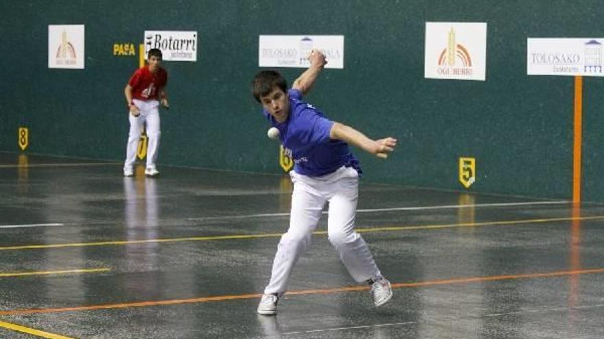 Los pronósticos que daban como ganadora a la pareja tolosarra en categoría cadete acertaron de pleno, y Ioritz Egiguren y Jon Ander Peña vencieron a los oiartzuarras Zigor Salaberria y Ekain Etxeberria por un claro 22-6. La pareja de Tolosa regaló muy pocos tantos, y Peña se mostró muy seguro y fiable en sus intervenciones.