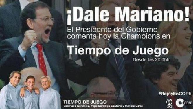 donostia - El presidente del Gobierno español, Mariano Rajoy, no irá al debate a cuatro que Atresmedia ha programado el 7 de diciembre (el PP enviará a Soraya Sáenz de Santamaría), pero los españoles podrán escuchar al jefe del Ejecutivo y candidato a la reelección en retransmisiones deportivas como la de la Champions League de fútbol anoche en la Cadena Cope o en la entrevista que el 12 de diciembre, en pleno ecuador de la campaña electoral, María Teresa Campos le hará en el programa de Telecinco ¡Qué tiempo tan feliz!.