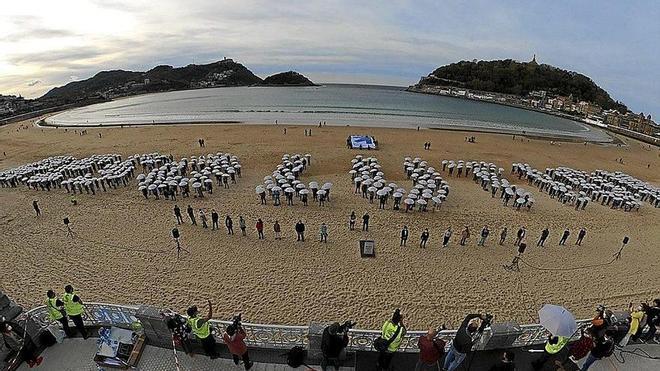 La red ciudadana de apoyo a los presos de ETA tenía previsto llevar a cabo una manifestación que, debido a la pandemia de COVID-19, finalmente fue sustituida por la formación del mosaico en el arenal donostiarra mediante paraguas blancos.