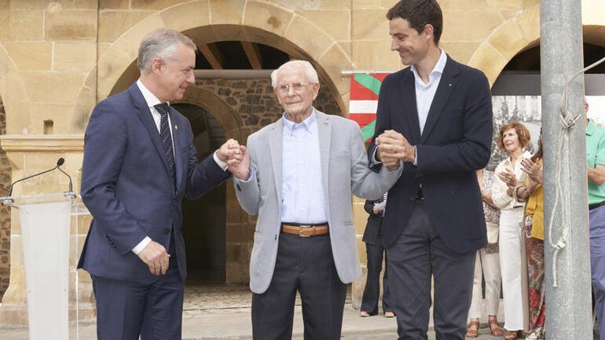 El acto de homenaje ha comenzado con la izada de la ikurriña, mientras los txistularis de Bermeo han tocado el Himno de 'Eusko Abenda'. A continuación, el lehendakari, Iñigo Urkullu, el alcalde de Bermeo, Aritz Abaroa, y Juan Azkarate han descubierto la placa, y los miembros de Alkartasuna Dantza Taldea de Bermeo han bailado un aurresku de honor.
