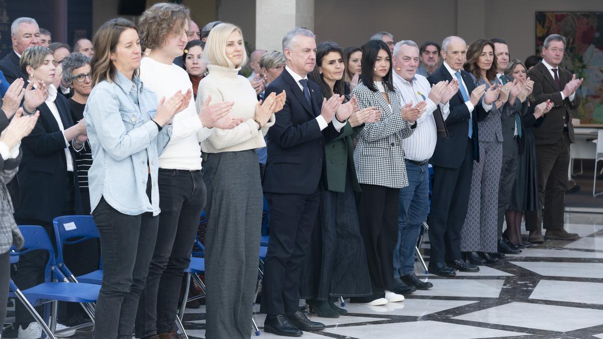 El Gobierno vasco ha rendido homenaje este viernes a las entidades sociales que han hecho posible la acogida de los refugiados ucranianos, a las familias vascas y a los propios afectados por la guerra, quienes han tenido un protagonismo especial en el acto celebrado en el atrio de Lehendakaritza. Durante el acto, se han proyectado varios vídeos con testimonios que dejan ver el desgarro por tener que abandonar su país de origen, pero también entereza para comenzar una nueva vida, aunque siempre con el corazón partido.