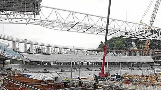 anoeta. A lo largo del día de ayer y ante la atenta mirada de muchos curiosos, se colocó la segunda cercha de Anoeta. Dos semanas después de la instalación de la primera, los operarios trabajaron durante toda la mañana para fijar de forma milimétrica la cercha en el Fondo Sur. Las dos grandes grúas pluma que la izaron se fueron desplazando al Fondo Sur durante estos últimos días. La cercha metálica tiene unas dimensiones de unos ocho metros de ancho por diez de alto y una longitud de más de 150 metros. Foto: Ruben Plaza