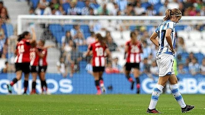 Poco a poco, el derbi tendió a lo que podía esperarse de la situación generada por el gol. Dominio txuri-urdin en pos del empate. Y contragolpes de un Athletic aferrado a la velocidad de la mencionada Azkona. A las de Gonzalo Arconada les costó meter mano al rival con el balón. Su homólogo en el banquillo contrario, Ángel Villacampa, tapó la banda diestra realista gracias a la férrea vigilancia a Lucía por parte de Nekane. Obligó así a iniciar por el sector de Iraia. Y las ofensivas locales en estático se resintieron una barbaridad. Lo hicieron en cuestión de peligro generado. Pero al menos metieron al Athletic en su campo, abriendo dos vías para hacer daño: la presión tras pérdida y los errores del adversario en la salida del esférico. No hubo ocasiones clarísimas, pero sí cuatro o cinco opciones nítidas de transición en las que faltó acierto en el último pase.