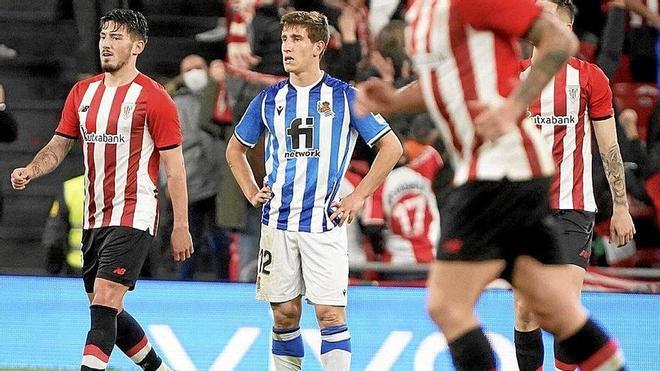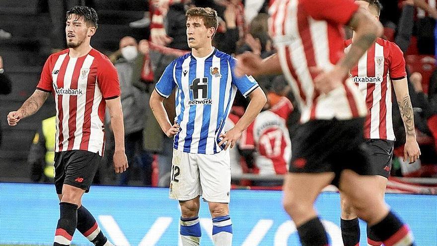Dicho y hecho. Pero con matices, claro, porque el Athletic no es el Leipzig. Hablamos de dos rivales con características muy distintas. A los de Marcelino no les puedes regalar el balón ni concederles la posibilidad de bombardear tu área con centros laterales, porque son poderosos en el juego aéreo y porque, al menos con el 0-0 inicial, ellos tampoco van a querer el esférico. Así que la Real asumió en Bilbao que la posesión iba a ser suya. Lo hizo, sin embargo, desde un registro muy precavido, pensado a partir de una premisa principal: no equivocarse. La segunda prioridad, mientras, residió en que, si tocaba incurrir en pérdidas, era mejor hacerlo en la banda y no en las parcelas interiores. Dentro de ese panorama general más bien sosete, buscado por la propia escuadra txuri-urdin y aceptado por el rival, Aihen y sobre todo Gorosabel se erigieron en vías de salida durante el primer tiempo, apoyados en la clásica salida de tres. Tras el descanso, en cambio, algo se ajustaron los locales para tapar mejor al arrasatearra: dieron incluso un pasito atrás en cuanto a situación del bloque, pero compensaron esto mediante dos pasos adelante en cuanto a agresividad con y sin balón. La Real empezó a explorar el juego por dentro, casi obligada. El Athletic, a robar y a contragolpear. Fue el principio del fin. Poco importa que este se escenificara luego a balón parado.