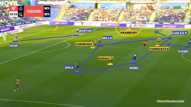 Como suele resultar habitual en los rivales de la Real, Bordalás se centró en tapar a los txuri-urdin todas las vías interiores. Lo hizo planteando, como punto de partida, un tres contra tres en la medular: el mediapunta Uche con Zubimendi, Milla con Brais y Nabil con Turrientes. Las primeras posesiones visitantes arrancaban con el punta Bertug encargándose él solo de los centrales Zubeldia y Pacheco. Sin embargo, esta era solo la primera fase de un mecanismo de presión bastante más complejo...