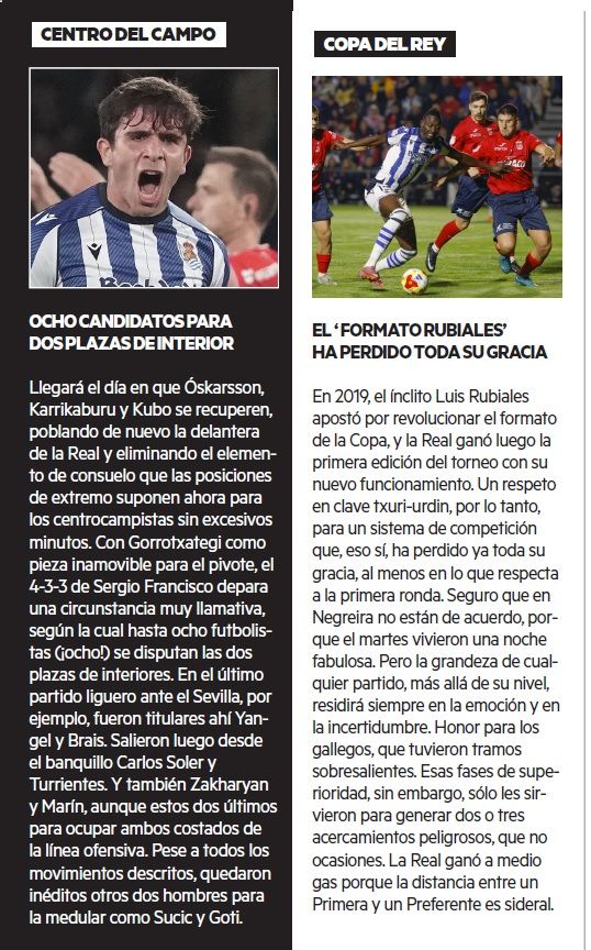 El caso es que la Real se vio 2-1 arriba y durante la media hora final sucedieron dos cosas, una mala y otra buena. La negativa residió en que la confección de la plantilla limitó las posibilidades de estirar al equipo en ataque, en un contexto de defensa replegada. Compro que faltaba Kubo y que, con el nipón de titular, las piernas de Guedes habrían ayudado en la segunda parte. Compro igualmente que Óskarsson (lesionado) y Sadiq (fuera de la convocatoria) pueden aportar algo de profundidad. Pero a un servidor la explosividad al espacio del propio Guedes se le queda corta como principal y casi único argumento txuri-urdin para amenazar a zagas adelantadas. Anoeta asistió ante el Sevilla a 30 minutos monotemáticos: despeje y defensa, despeje y defensa, despeje y defensa, un panorama que le aboca a uno al sufrimiento pero que el equipo (y aquí está lo positivo) gestionó de forma adecuada. Fue una importante novedad respecto a las sensaciones previas de ternura y de fragilidad.