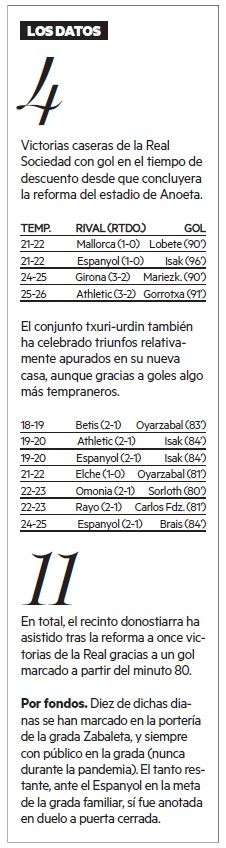 Las cifras globales de la Real en casa, en cuanto a resultados, apenas han variado tras la reforma de Anoeta respecto a la etapa de las pistas de atletismo. Pero sí existen datos que refuerzan el poder de ese fondo de animación, que ocupa el colectivo Bultzada y recibe el nombre del seguidor txuri-urdin asesinado en 1998 por ultras del Atlético de Madrid. Durante estos siete años, la Real ha ganado como local un total de once encuentros marcando el gol del triunfo a partir del minuto 80. Y diez de ellos, todos menos uno, se han anotado en la portería de Zabaleta. Sí, es cierto que normalmente el equipo ataca allí en las segundas partes y que tal circunstancia condiciona la estadística, pero esta tampoco supone un reflejo proporcional de las veces en que el adversario gana el sorteo de campos y decide alterar el orden habitual.