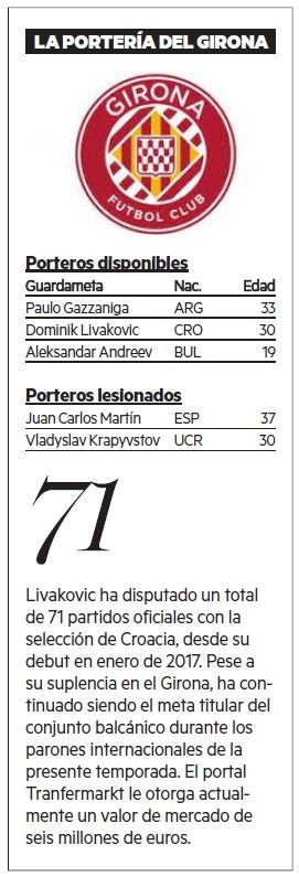 La actual temporada ya había comenzando cuando este último, Juan Carlos, se lesionó gravemente una rodilla a finales de agosto. Pero entonces el Girona pareció hallar una formidable solución en el mercadillo persa que se organiza siempre durante las horas previas al cierre de la ventana de fichajes. El Fenerbahce turco incorporaba a Ederson, del Manchester City. Y tenía que dar salida al arquero titular de la selección de Croacia, Dominik Livakovic. El balcánico, visto el nivel de su competencia (Gazzaniga) en las primeras jornadas, se las debió prometer muy felices al poner rumbo a Montilivi, cedido. Tres meses y medio después, no ha debutado aún con el equipo catalán. ¡Ni piensa hacerlo ya!