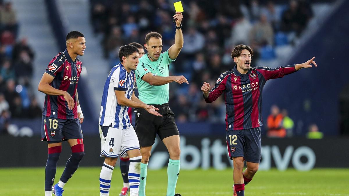 La Real Sociedad afrontará el partido del próximo domingo 4 de enero ante el Atlético de Madrid (en Anoeta a las 21.00 horas) con dos futbolistas sancionados. Igor Zubeldia y Jon Gorrotxategi vieron este sábado en el campo del Levante sendas tarjetas amarillas que les implican estar sancionados para la visita de los colchoneros. El otro jugador txuri-urdin apercibido, Brais Méndez, también estuvo cerca de tener que perderse el siguiente encuentro, tras señalarle Cuadra Fernández una falta muy protestada por los futbolistas locales.
