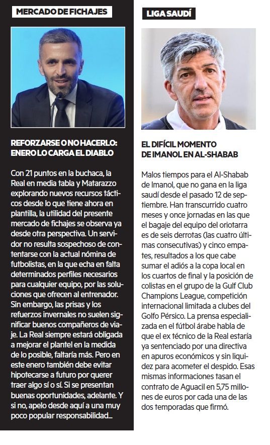 Al final del encuentro, digerido ya el alegrón por el 1-2 de Aramburu, pudo quedar en clave txuri-urdin la sensación de “sí pero”. “Sí, hemos ganado, pero sufriendo así ante un rival tan mermado no vamos a ninguna parte”. “Sí, saben ricos los tres puntos, pero encajando gol en 18 jornadas de 19 sufriremos para salvarnos”. Yo, en cambio, prefiero mirar al equipo desde una perspectiva más optimista, porque Matarazzo ha heredado una situación clasificatoria que implica sí o sí titubeos como los mostrados el viernes durante 20 minutos para olvidar. Que a esta Real aún le pueden temblar las piernas es un hecho: esperemos que los puntos ayuden a ganar también en seguridad y en autoestima. Pero resulta igualmente evidente que, cuando los encuentros transcurren según lo preparado, el conjunto blanquiazul ha mostrado ilusionantes brotes verdes en estos dos últimos partidos, algo que personalmente hago extensible a la primera parte de Getafe. Escasearon las oportunidades, sí. No faltaron, sin embargo, ritmo, intención ni variedad de herramientas tácticas. Algunas se utilizaron con el mismo acierto que eché luego de menos para el pase o para el centro decisivos. Aunque ahí quedan las ventajas que sí se generaron.
