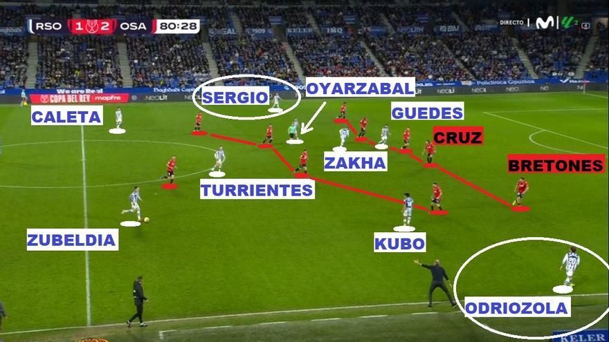 Pasaron los minutos, se mantuvo el 0-2 para Osasuna y la Real, desde la obligación de arriesgar, pasó a recurrir en mayor medida a su salida con sólo dos centrales, Zubeldia y Caleta-Car, proyectando también por banda a Jon Mikel Aramburu. El 4-4-2 rojillo comenzó a sufrir ante las ofensivas txuri-urdin, que en cualquier caso no gozaban de la amplitud deseada al convertirse el propio Aramburu en un atacante más. El venezolano ya había ejercido este rol profundo en encuentros anteriores, pero la empresa de la remontada copera exigía posiblemente un perfil más específico.