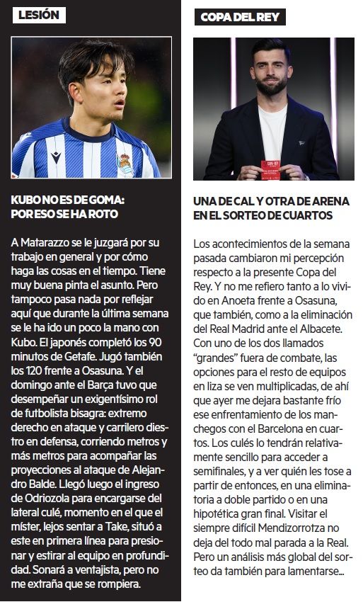 Luego contra el Barça vimos lo que vimos. Y, aquí sí, toca reconocer que Real tuvo a los santos de su lado para ganar a los culés, tirando de lo que coloquialmente se conoce como potra pero acompañándola también con una guarnición indispensable para la consecución del éxito: corazón, energía, convencimiento, intensidad... A los txuri-urdin les impulsaron de forma invisible esas inexplicables dinámicas positivas que se dan a menudo tras los relevos en el banquillo y que aún mantienen a la escuadra de Matarazzo tocada por una varita. Para que semejantes estados de gracia se plasmen en triunfos y puntos, eso sí, la magia debe alcanzar la cabeza y las piernas de los futbolistas, aún afectados por el cambio de patrón en el caso de esta Real. No sé si el ya célebre “You have been Matarazzed” puede aplicársele a los rivales, menos aún a un Barcelona superior en Anoeta. Pero quienes a buen seguro han sido “Matarazzed” son los jugadores blanquiazules. Emanan una fuerza que invita al optimismo. Aunque conservarla en el tiempo resultará complejo. Tarde o temprano deberán recurrir a otro tipo de argumentos.