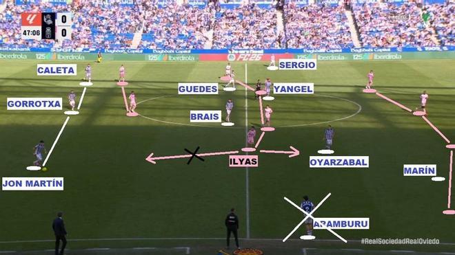 Durante esos 60 minutos iniciales durante los que el Oviedo contrarrestó a la Real, se echó de menos que la Real buscara con mayor ahínco situaciones generadas desde el aprovechamiento de esa puerta exterior (pase a los laterales) que le concedió el rival y cuyo umbral apenas quisieron cruzar los txuri-urdin. La profundidad no sólo podía hallarse desde conexiones en la espalda de la medular rival. También podía encontrarse desde los pases fuera ante un adversario que, en jornadas anteriores, siempre había mantenido innegociable su línea de cuatro defensas, incluso contra equipos que (como la Real) poblaban sus respectivos ataques con líneas de hasta cinco hombres.