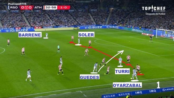 El técnico estadounidense pensó para la vuelta en Anoeta en intercambiar la orientación de los ataques txuri-urdin respecto a la ida. Es decir, salir por la izquierda y lanzar a la derecha. Así se explica la titularidad de Barrene, destinado a ser punto de partida de las diagonales con las que la Real buscaría a Guedes, ubicado esta vez en la banda diestra.