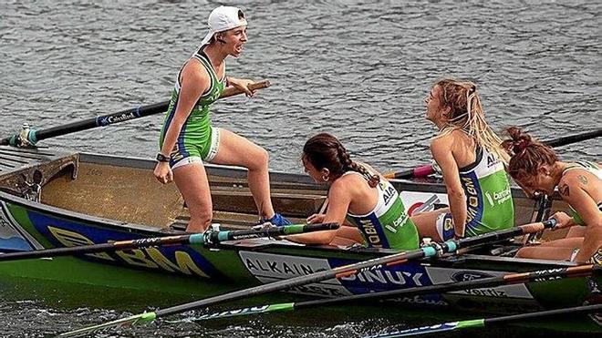 Sin embargo, las verdes pronto remontaron los dos segundos que tenía de pérdida en la baliza exterior. Una buena ciaboga guiada por una patrona de gran nivel como Nerea Pérez permitió a las bidasotarras adelantara a Zumaia al inicio del largo de vuelta. Después, buscando esquivar la corriente, que bajaba fuerte desde Bilbao poco antes del cambio de mareas, se fueron las tres embarcaciones a estribor. Especialmente la Telmo Deun, que se aproximó más que nadie a la pared de Portugalete. Ahí donde menos potencia tenía la corriente, pero, también, donde menos agua había para remar. Ahí se quedó Zumaia fuera de la lucha.