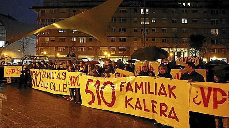 Donostia. Vecinos de la Plaza José María Sert de Donostia participaron ayer en una protesta convocada por Stop Desahucios para denunciar la irrupción “especulativa y antisocial” de los “fondos buitre”, y mas concretamente, de Blackstone, que compró una promoción de 520 viviendas VPO de promoción privada que están sujetas a control público solo hasta 2028, informó esta organización en un comunicado. Además, se pidió la retirada de la orden de desahucio contra una vecina que se encuentra en régimen de alquiler. Foto: I. Azurmendi