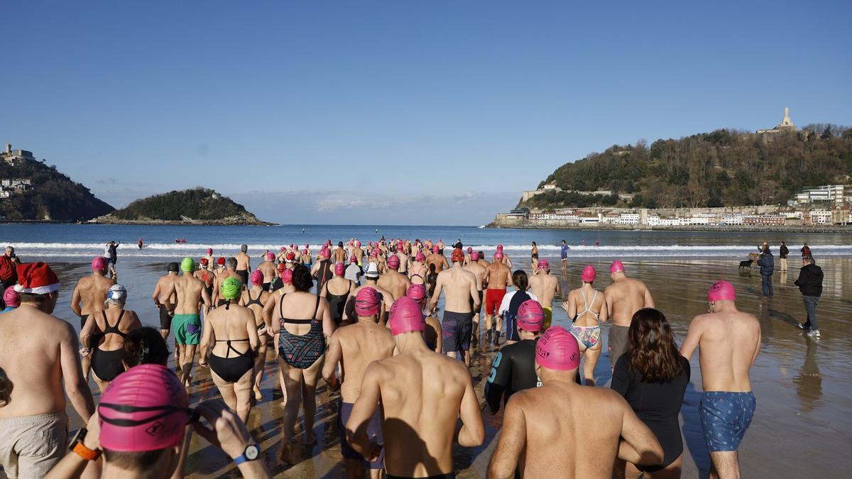 Organizada por el club deportivo Fortuna, la tradicional cita navideña ha discurrido a mediodía, cuando los participantes, entre los que había jóvenes y mayores, han salido a la vez de la meta instalada en la arena y han recorrido a nado, cada cual a su ritmo, unos 300 metros de trayecto balizado en aguas de la bahía donostiarra.