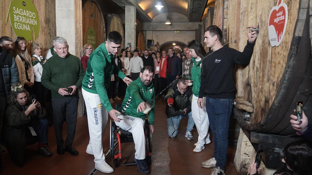 Mitxelena, junto a los pelotaris Enara Garminde, Eñaut Lizeaga y Beñat Lizaso han sido los protagonistas de la apertura oficial del txotx. Antes de que esa se llevara a cabo en la sidrería Petritegi, las estrellas del txotx han ofrecido unas breves declaraciones a periodistas e invitados.