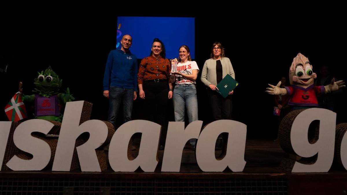 Adriana Urmeneta e Irati Abio han sido las encargadas de recoger el reconocimiento en nombre de Errigora, que ha aprovechado el acto para presentar a Orburutxo y Zainzuriñe, dos mascotas de la iniciativa que se podrán ver en diferentes puntos del trazado de la próxima Korrika.