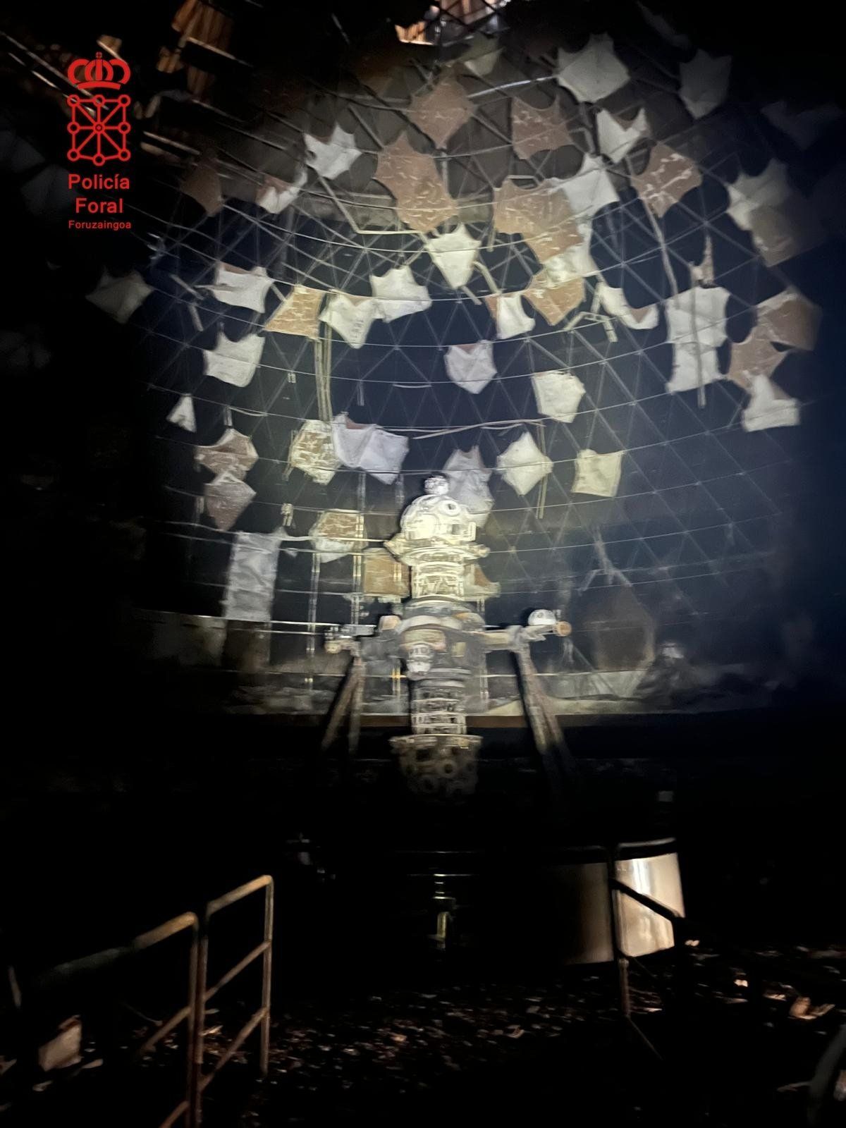 Los drones que utilizan el grupo de apoyo tecnológico de la Policía Foral detectaron el importante riesgo de la estructura y fueron guiando la actuación midiendo la temperatura con la cámara térmica. Los bomberos lo atacaron desde dentro del edificio, pero al otro lado de la puerta de acceso a la sala. Había que refrescarlo como fuera, y así lo lograron. El riesgo de hundirse disminuyó toda vez que el incendio comenzó a perder viveza y, al menos, la cúpula se mantuvo en pie. Su interior estaba arrasado, entre ellas un proyecto óptico planetario que es un referente y una platea con más de 200 butacas.