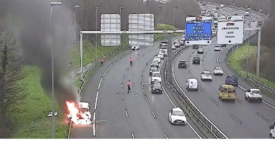 Un vehículo ha ardido este viernes por la tarde en la carretera GI-20, en el kilómetro cuatro, a la altura de Errenteria, en el sentido Bilbao. El accidente ha generado retenciones debido a que la Ertzaintza ha tenido que cerrar dos carriles.