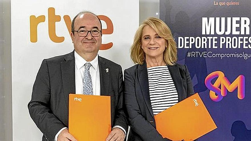 Elena Sánchez Caballero, presidenta interina de RTVE y de su Consejo de Administración; y Miquel Iceta, ministro de Cultura y Deporte, han rubricado un protocolo general para promover el tratamiento informativo igualitario entre mujeres y hombres en el ámbito deportivo con el que la Corporación mantiene su firme compromiso con el deporte femenino y su promoción y difusión en todos sus canales.